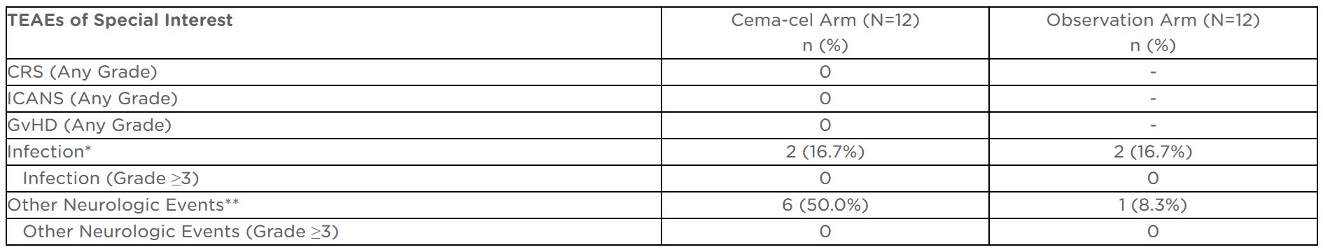 Cema-cel has been generally well-tolerated as of the data cutoff with no serious adverse events related to treatment. There were no cases of cytokine release syndrome (CRS), immune effector cell-associated neurotoxicity syndrome (ICANS) or graft-versus-host disease (GvHD) in the Treatment Emergent Adverse Events (TEAEs) of Special Interest category, which captures adverse events associated with CAR T.