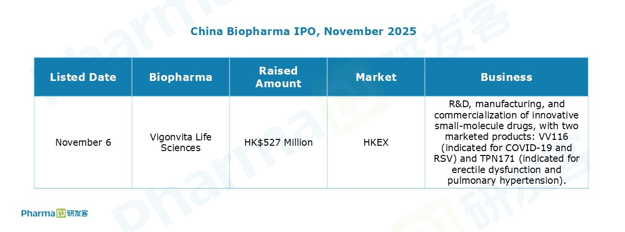 In November, Suzhou Vigonvita Life Sciences successfully listed on the Hong Kong Stock Exchange (HKEX), with its share price surging 177% on its trading debut and market capitalization reaching HK$15.5 billion. As a commercial-stage biopharmaceutical company, it specializes in the R&D, manufacturing, and commercialization of innovative small-molecule drugs, with two marketed products: VV116 (indicated for COVID-19 and RSV) and TPN171 (indicated for erectile dysfunction and pulmonary hypertension).