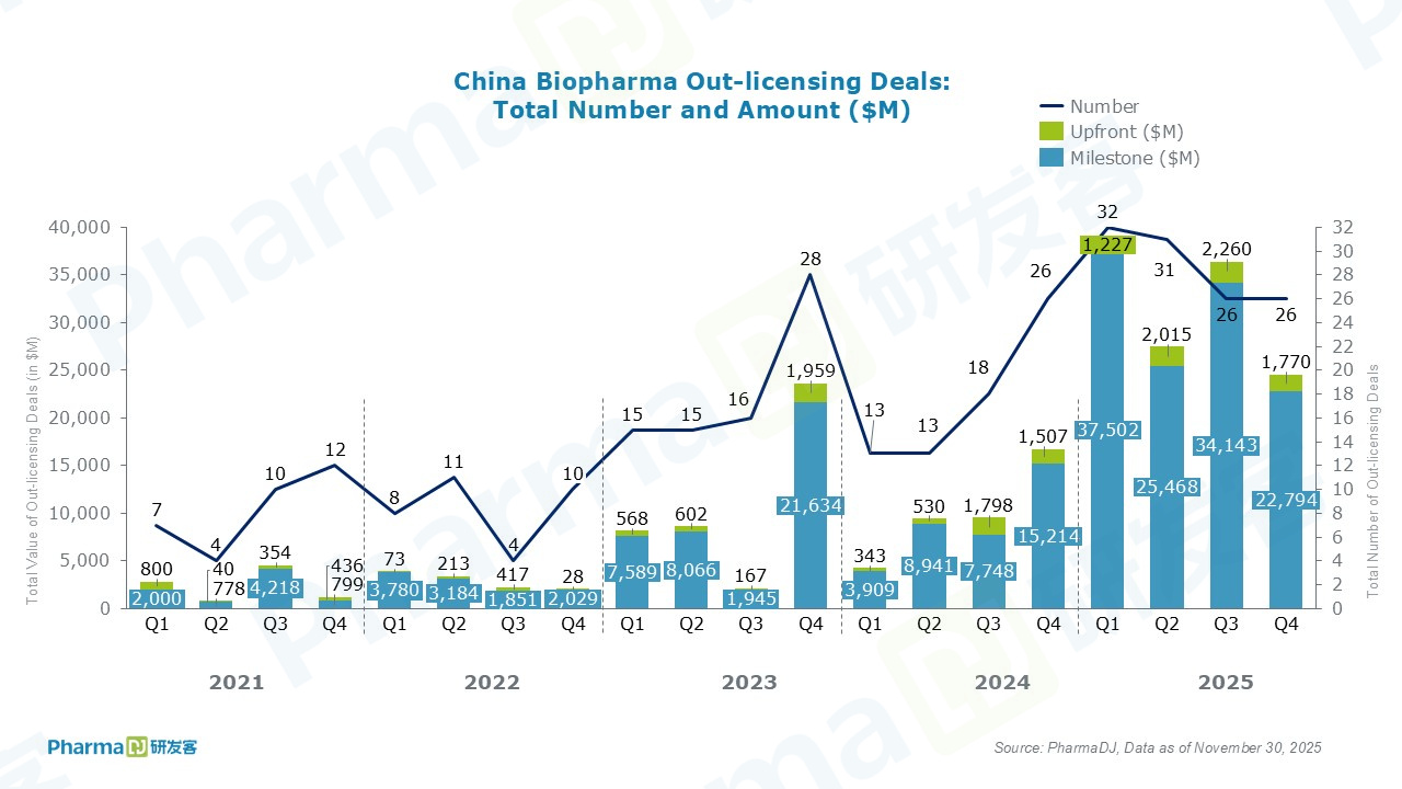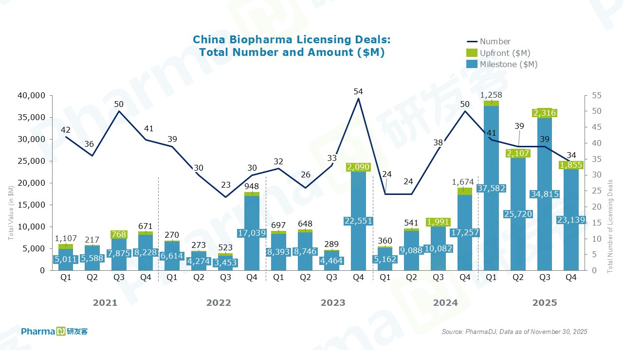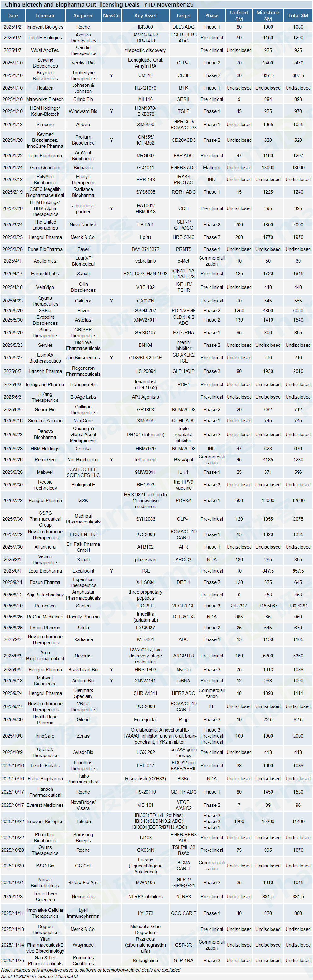 In November, the deal with the highest upfront payment was the collaboration between Laekna and Qilu Pharmaceutical, featuring an upfront payment of RMB 530 million for the AKT inhibitor LAE002 (afuresertib). The total potential value, encompassing the upfront payment and subsequent milestone payments, amounts to RMB 2.045 billion.