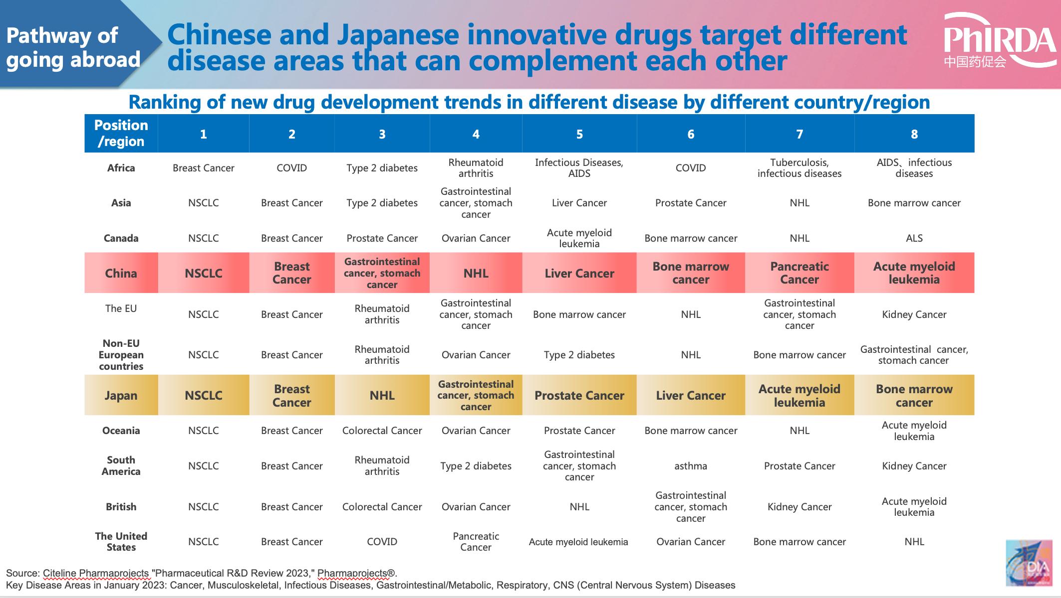 では、日本の患者向けに新薬を開発する場合、中国企業はどのような疾患領域に注力する必要があるのだろうか? 前述した張 志絹氏は、日本と中国でそれぞれ1位から8位までの開発中疾患のうち、非小細胞肺がん、乳がん、消化器がん/胃がん、非ホジキンリンパ腫、肝臓がん、急性骨髄性白血病、骨髄がんの7種で重なると指摘する。 “中国と日本の疾病スペクトルは類似しており、補完的である”と張 志絹氏は語った。(図3参照)