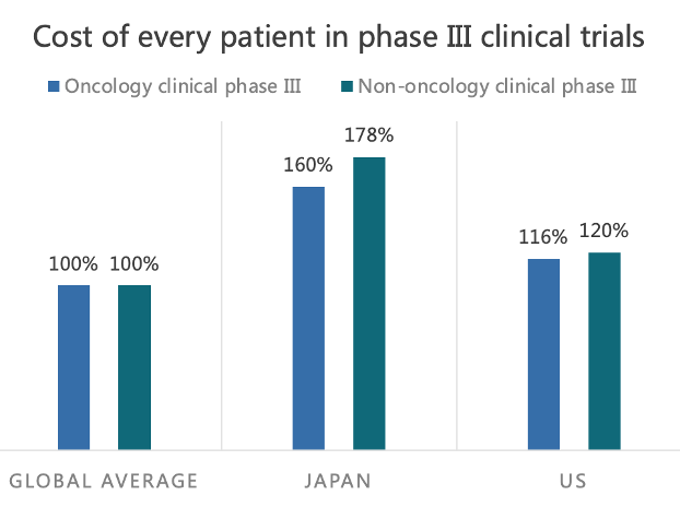 図10:世界平均、日本、米国のそれぞれにおける第Ⅲ相臨床試験の患者一人当たりの費用