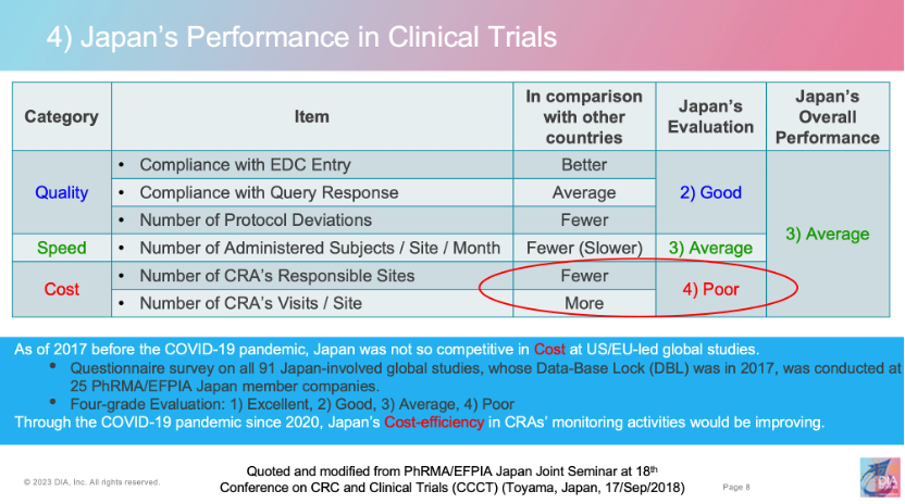 一方、高野氏は、発表スライドの1枚で、治験における日本のperformanceについてまとめた。 2017年時点での日本が参加したMRCTsに関するPhRMA/EFPIA加盟25社を対象としたアンケート結果によれば、日本の治験は質の面では良好、スピードの面では中程度、コストの面では高額であった。 しかし、2020年のCovid-19流行以降、日本におけるCRAsのモニタリング費用効率は改善しているだろうと彼は述べた。 (図11参照)