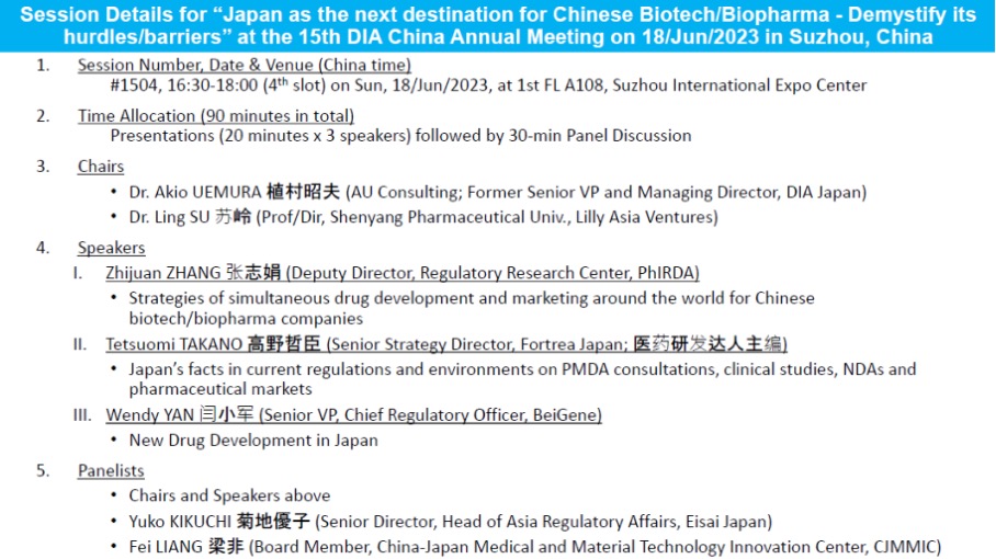 アンケート結果に基づき、6月18日に蘇州で開催された第15回DIA中国年会では、「Japan as the next destination for Chinese Biotech/Biopharma - Demystify its hurdles/barriers”」と題したセッションが開催され、中国製薬企業の日本への海外進出戦略が活発に議論された。本号ではその様子を詳細にレポートする。