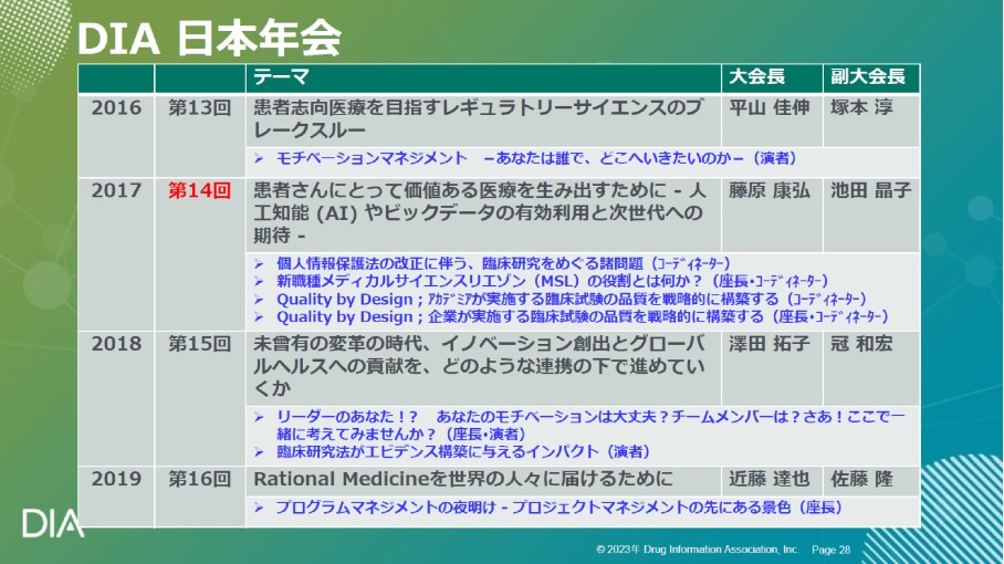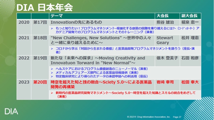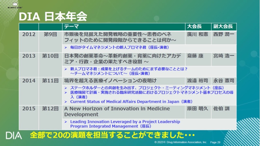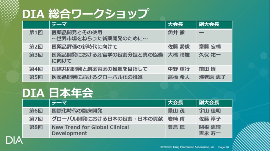 岩崎大会長ご自身も、2012年の第9回以降、12年連続して登壇し、合計20ものセッション/演題に貢献されているが、岩崎氏同様、これまで計20回のDIA日本年会の歴代の大会長、副大会長の方々の多くが、今も現役のbig contributorsである。