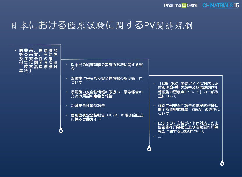 では、中国企業が日本へ進出しようとする場合、その計画をどのように策定すればよいか。中国における初期段階の臨床データを利用して日本の治験計画を構築し、新薬開発プロセスを加速するにはどうすればよいか。日本では医薬品の治験中のファーマコビジランス (PV) についてどのような要件があるか。日本で治験をスムーズに進行させるためのコツは何か。