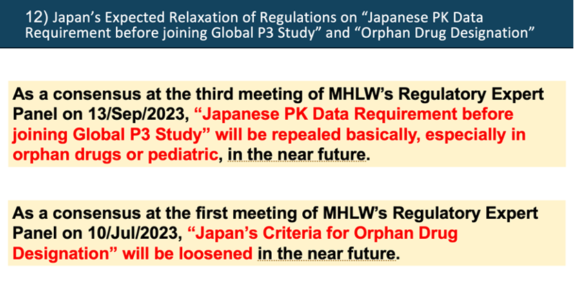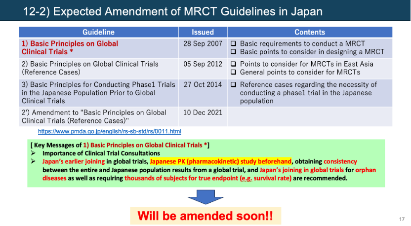 同氏は、今年7月10日に開催された第1回創薬力の強化・安定供給の確保等のための薬事規制のあり方に関する検討会(以下、薬事検討会)で議論された「オーファン指定要件の見直し」や今年9月13日に開催された第3回薬事検討会で了承された「国際共同治験開始前の日本人PKデータ原則不要化」、ならびにそれに伴う「国際共同治験に関する基本的考え方について」、「同(参考事例)について」、「国際共同治験開始前の日本人での第I相試験の実施に関する基本的考え方について」との日本独自のMRCT guidelines (国際共同治験に関する基本的考え方 3シリーズ) の近未来の改定可能性について言及した。