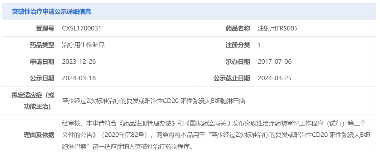 浙江特瑞思药业注射用TRS005获CDE拟纳入突破性治疗品种