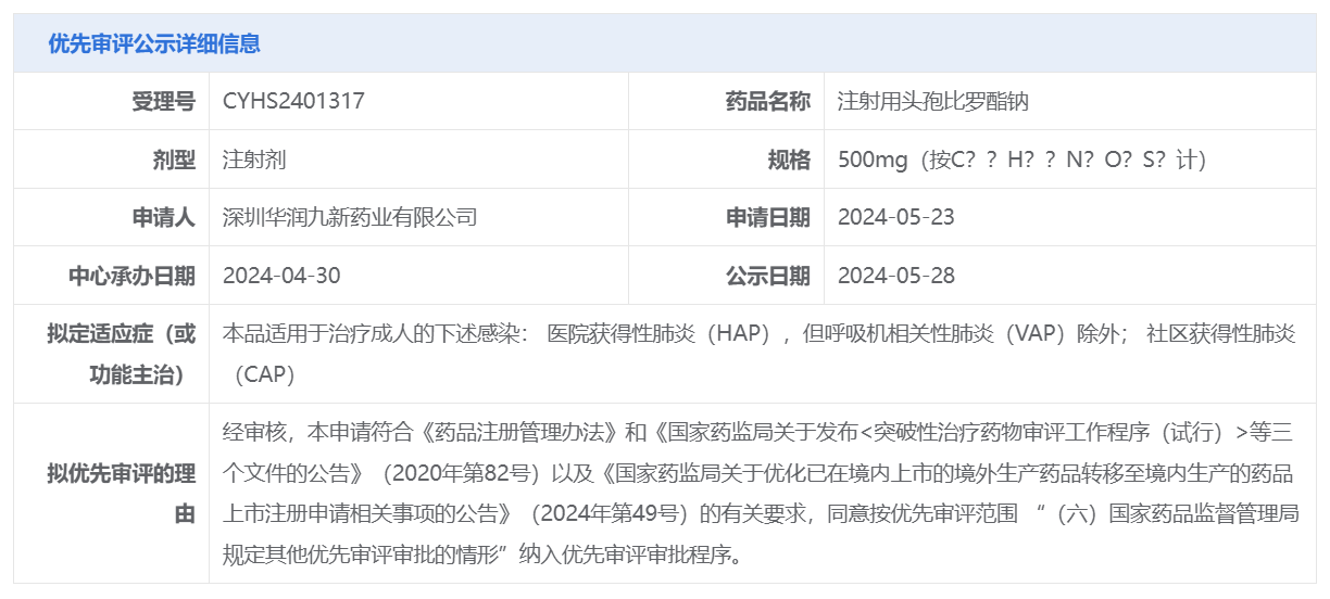 深圳华润九新药业注射用头孢比罗酯钠获CDE拟纳入优先审评