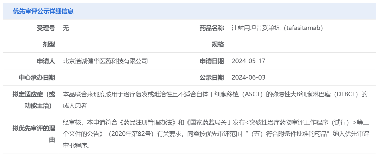 诺诚健华注射用坦昔妥单抗(tafasitamab)获CDE拟纳入突破性治疗品种
