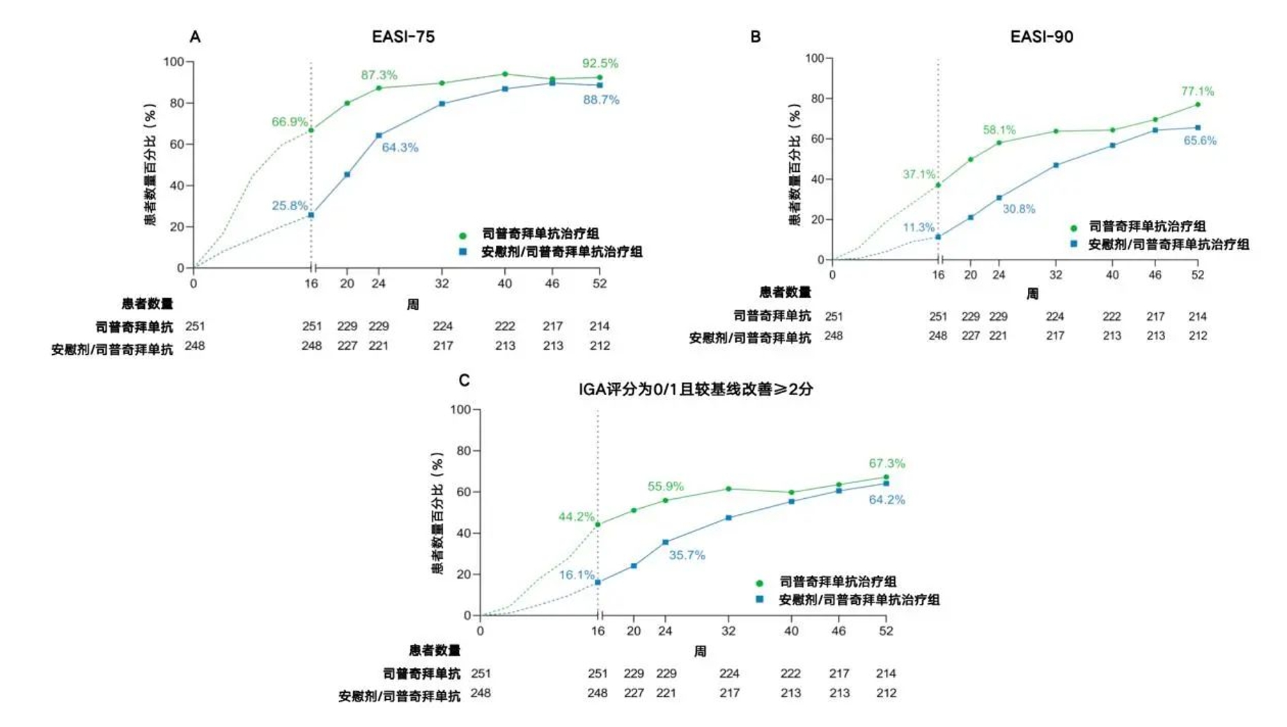 司普奇拜单抗维持治疗期间,EASI-75/90改善的达标率和研究者整体评分法(IGA)应答率持续上升,至52周,EASI-75达标率达92.5%,EASI-90达标率可达77.1%,IGA评分为0/1且较基线改善≥2分的患者比例达67.3%。