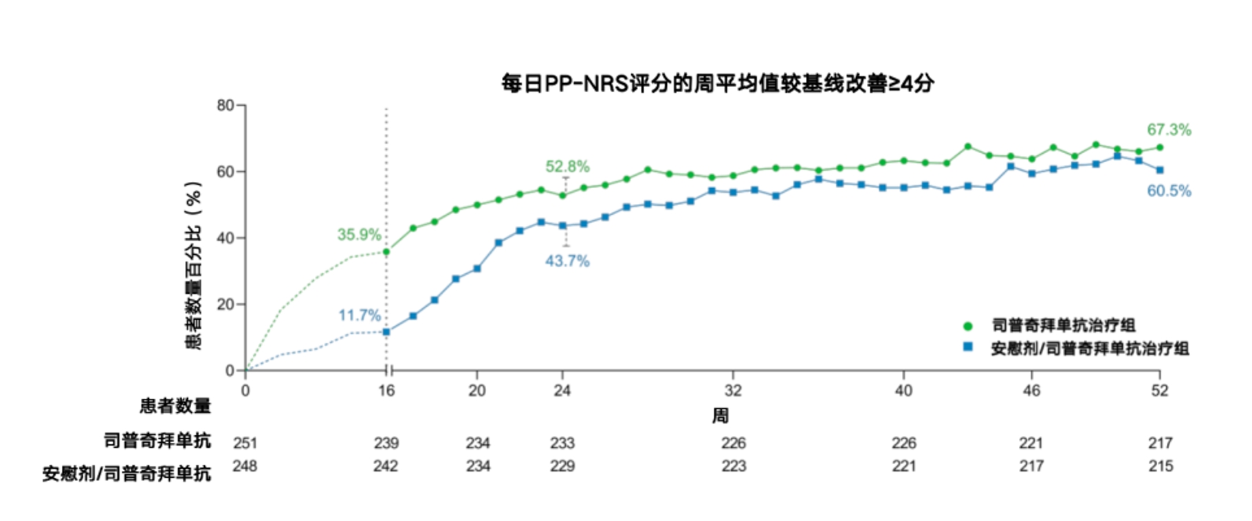 从峰值瘙痒数字评估量表(PP-NRS)疗效指标上来看,治疗第一天,司普奇拜单抗治疗组每日PP-NRS评分较基线变化率即显著优于安慰剂。治疗52周,司普奇拜单抗组与安慰剂转司普奇拜单抗组每日PP-NRS评分周平均值较基线降低≥4分的应答率分别为67.3%和60.5%。