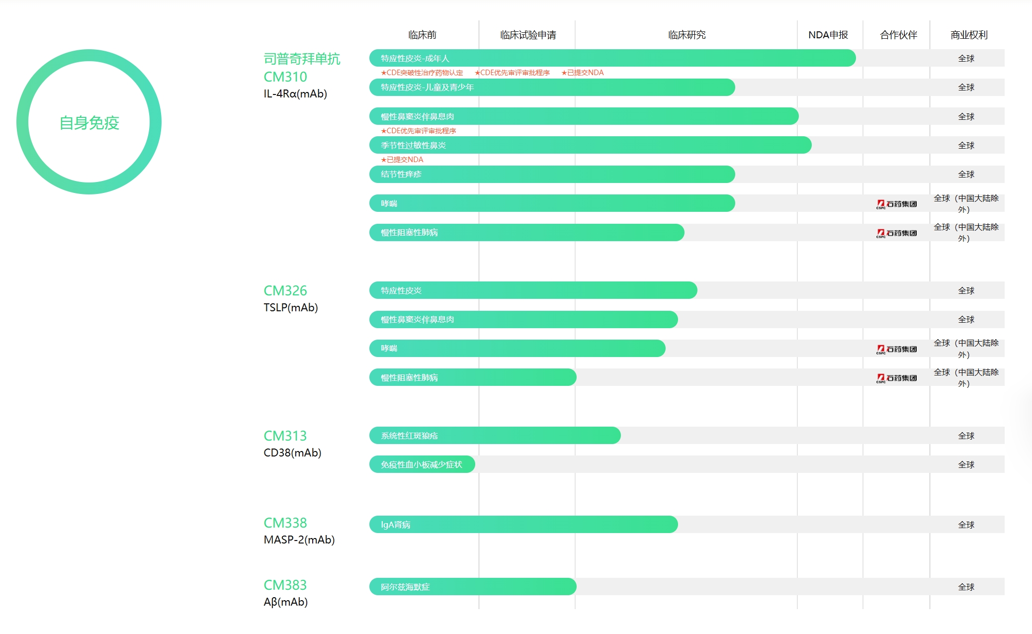 司普奇拜单抗另一针对慢性鼻窦炎伴鼻息肉的3期临床研究,已于去年底完成双盲治疗期数据揭盲及初步统计分析,共同主要终点均完全达标,该适应症已被纳入优先审评审批程序,康诺亚预计将于2024年就该适应症申报NDA。此外,针对青少年中重度特应性皮炎的3期研究也在进行中。