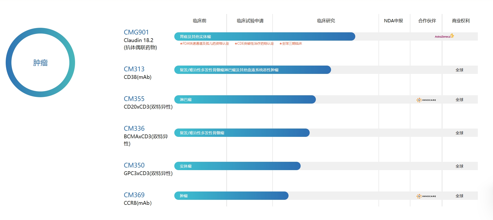 在肿瘤管线中,康诺亚自主研发的靶向Claudin 18.2 ADC药物CMG901,全球权益以近12亿美金的总额授权给了阿斯利康。CMG901仅用中国临床数据就率先获得了CDE突破性治疗药物认定和美国FDA快速通道资格。据最近召开的ASCO大会发布数据,CMG901具有良好的安全性和耐受性,在治疗晚期Claudin 18.2高表达胃癌/胃食管结合部腺癌受试者中表现出了优秀的疗效,中位总生存期(mOS)为11.8个月。