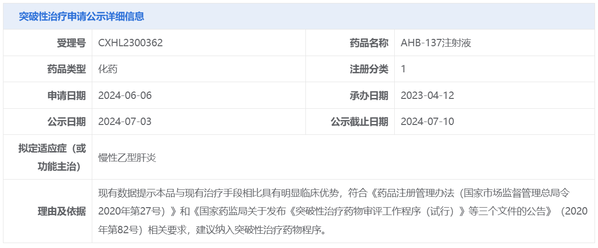 杭州浩博医药AHB-137注射液获CDE拟纳入突破性治疗品种