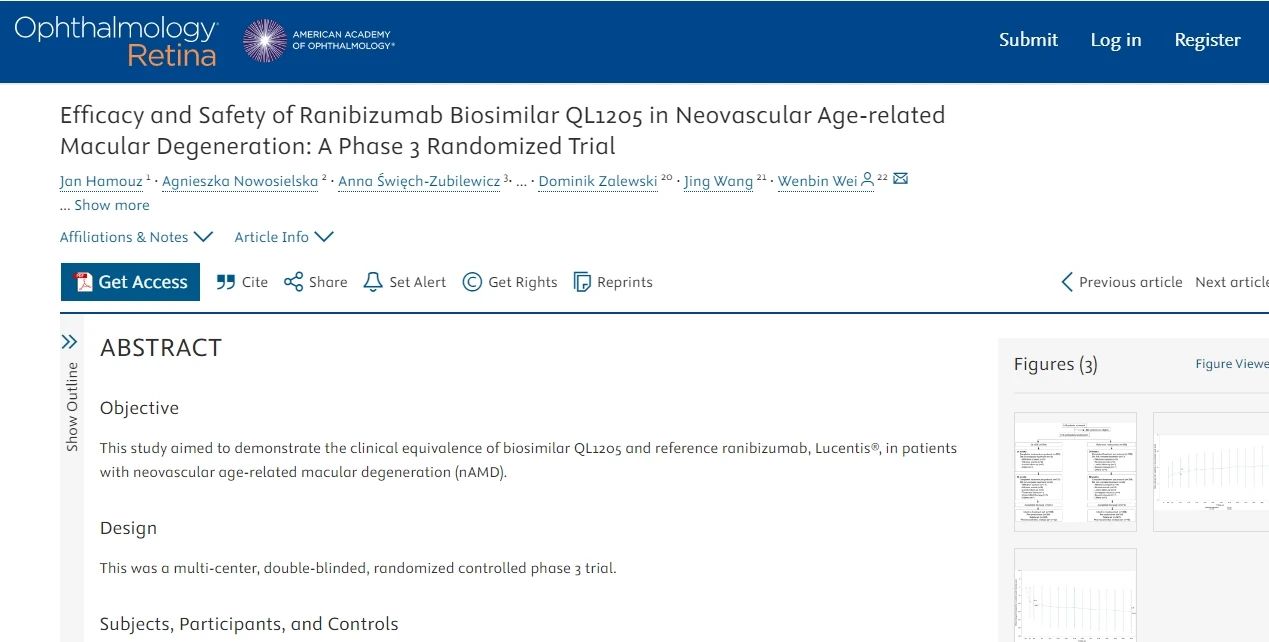 近日,齐鲁制药雷珠单抗注射液(QL1205)治疗新生血管性年龄相关黄斑变性(nAMD)的国际多中心III期研究结果在权威眼科学专业期刊《Ophthalmology Retina》(2023年度影响因子4.4,眼科学期刊排名9/95)发表。主要研究者和文章通讯作者为首都医科大学附属北京同仁医院魏文斌教授。