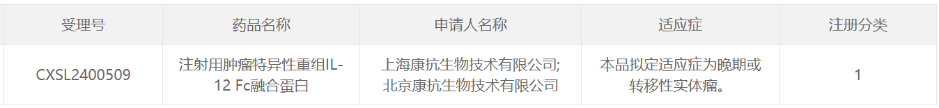 康抗生物注射用肿瘤特异性重组IL-12 Fc融合蛋白1类新药获CDE临床试验默示许可