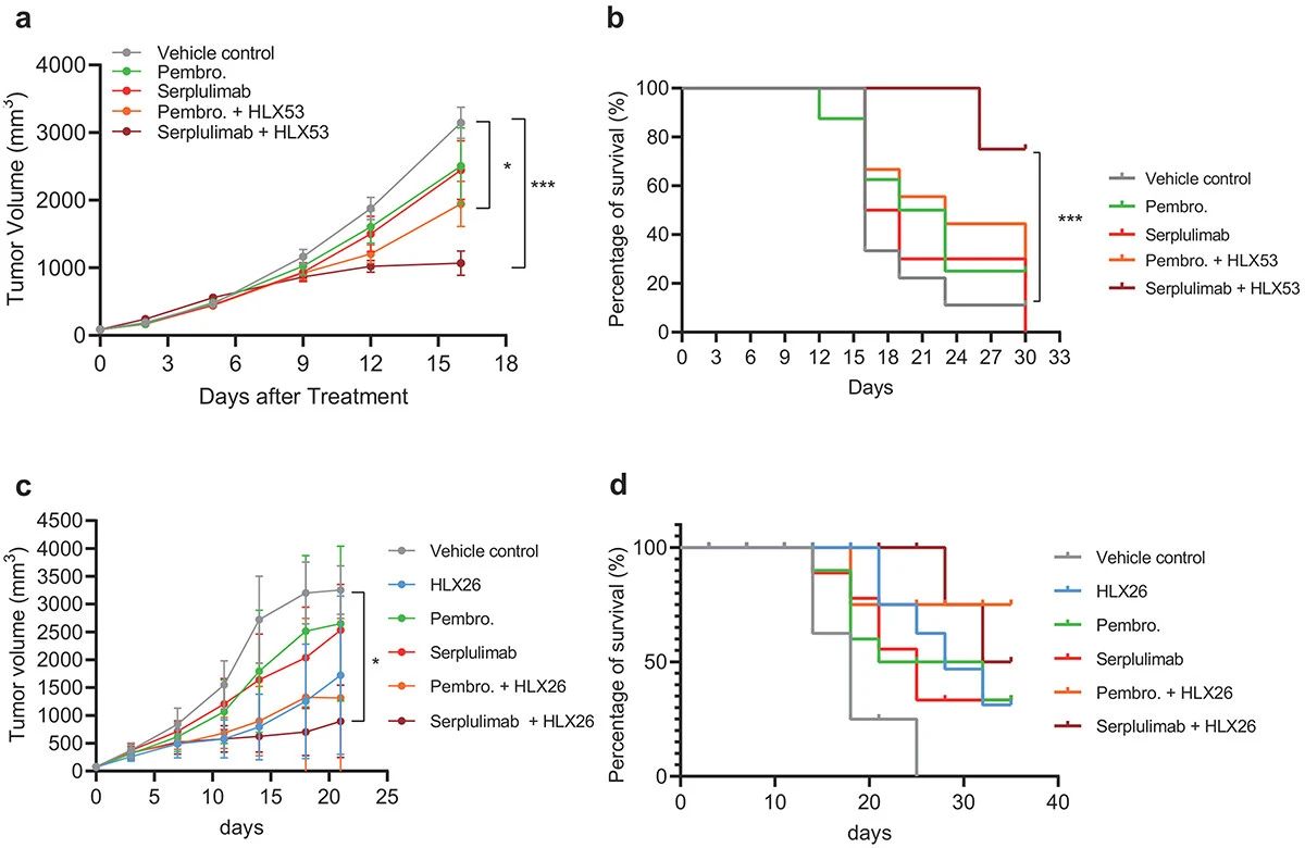 与此同时,研究者进一步探索了斯鲁利单抗、Pembrolizumab等抗PD-1单抗协同其他免疫检查点抑制剂的双免疫联合疗法的抗肿瘤疗效。研究结果显示,斯鲁利单抗联合 HLX53(抗TIGIT Fc融合蛋白)能够双重阻断 PD-1/TIGIT信号传导,在抗肿瘤活性(TGI/生存率)上优于PD-1抑制剂单药疗法,且斯鲁利单抗/HLX53联合治疗组较Pembrolizumab/HLX53潜在抗肿瘤活性更高。与Pembrolizumab 和Tiragolumab(抗TIGIT抗体) 的联合疗法相比,斯鲁利单抗联合HLX53能够显著增强效应CD4+T细胞、CD8+T细胞等免疫细胞在肿瘤内的浸润。此外,一系列研究数据表明,与Pembrolizumab/HLX53或Pembrolizumab/Tiragolumab联合疗法相比,斯鲁利单抗/HLX53的联合疗法对肿瘤微环境的诱导作用更强,有利于调动免疫细胞将 “冷 ”肿瘤变为 “热 ”肿瘤(SCLC通常被认为是一种免疫冷肿瘤),从而提高肿瘤免疫疗法的疗效。除TIGIT抑制剂外,斯鲁利单抗联合 HLX26(抗LAG-3单抗)也呈现出较单药治疗更强的抗肿瘤活性,有望进一步放大斯鲁利单抗作为免疫基石药物的治疗优势。