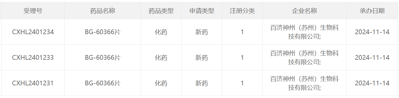 百济神州1类新药BG-60366片临床试验申请获NMPA受理