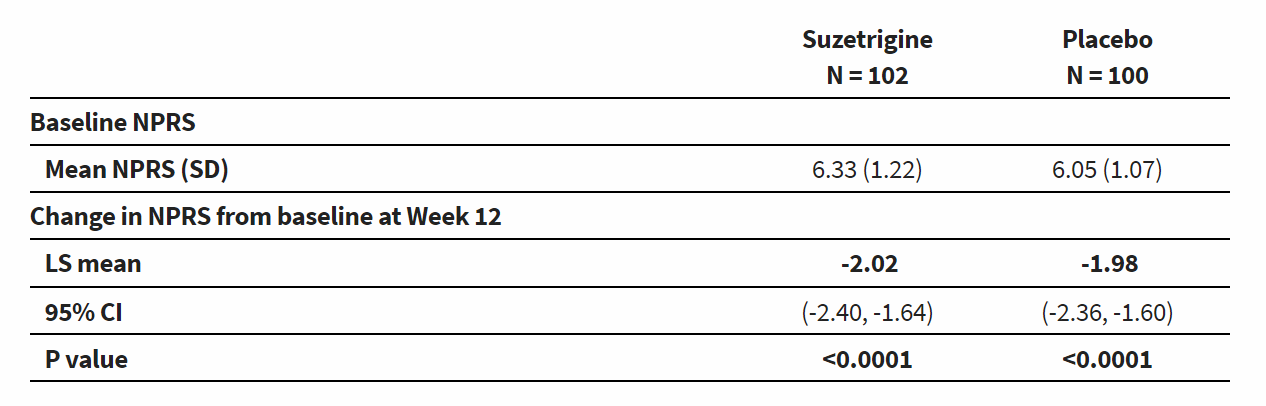 The study also included a placebo reference arm which showed a similar within-group reduction from baseline in pain with a mean change in NPRS at Week 12 of -1.98. The study was not designed nor powered for statistical comparison between suzetrigine and placebo.