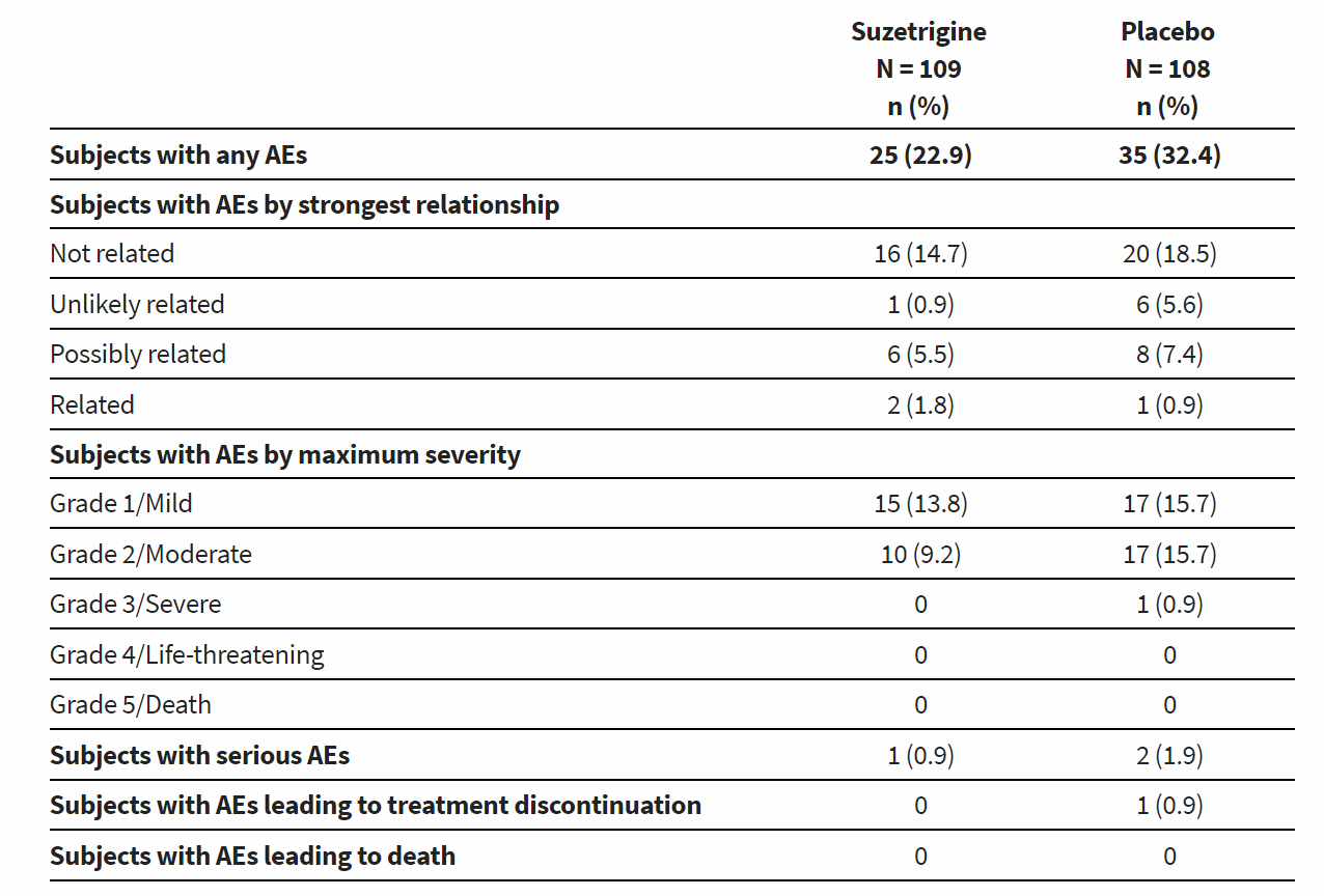 Suzetrigine was generally well tolerated in the study. The incidence of adverse events (AEs) was 22.9% in the suzetrigine arm and 32.4% in the placebo arm. In both treatment arms, most AEs were mild to moderate. There were no serious adverse events (SAEs) related or possibly related to suzetrigine. There were no AEs leading to treatment discontinuation in patients treated with suzetrigine.