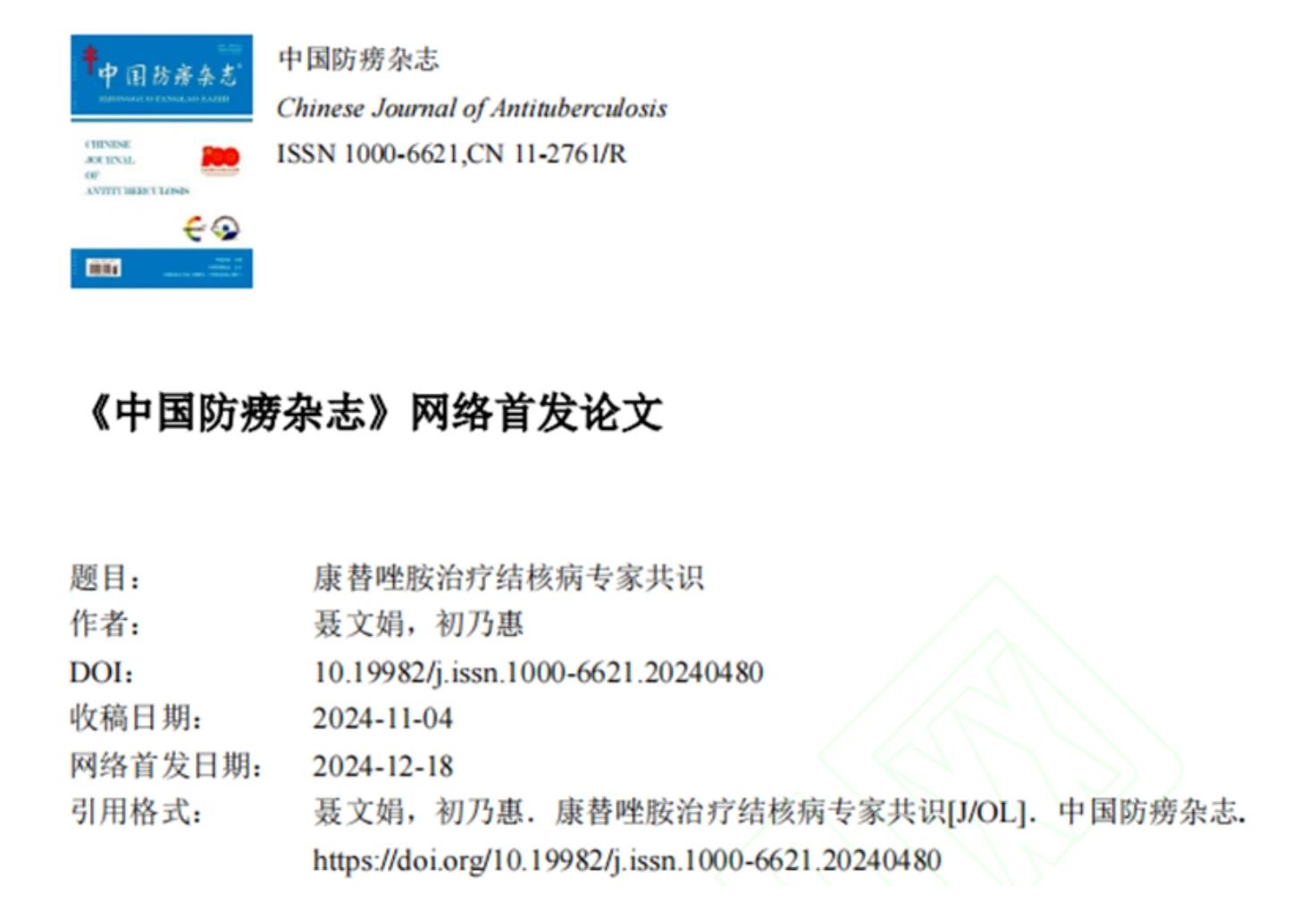2024年12月18日,《康替唑胺治疗结核病专家共识》在《中国防痨杂志》网络版中国知网线上平台正式首发(证书编号:202412189916)。这一里程碑式的结核领域中国专家共识,不仅为结核病的临床治疗提供了新的治疗策略与科学依据,也标志着康替唑胺在结核病治疗领域的应用迈入了崭新阶段,为全球结核病防治事业注入了新的活力。