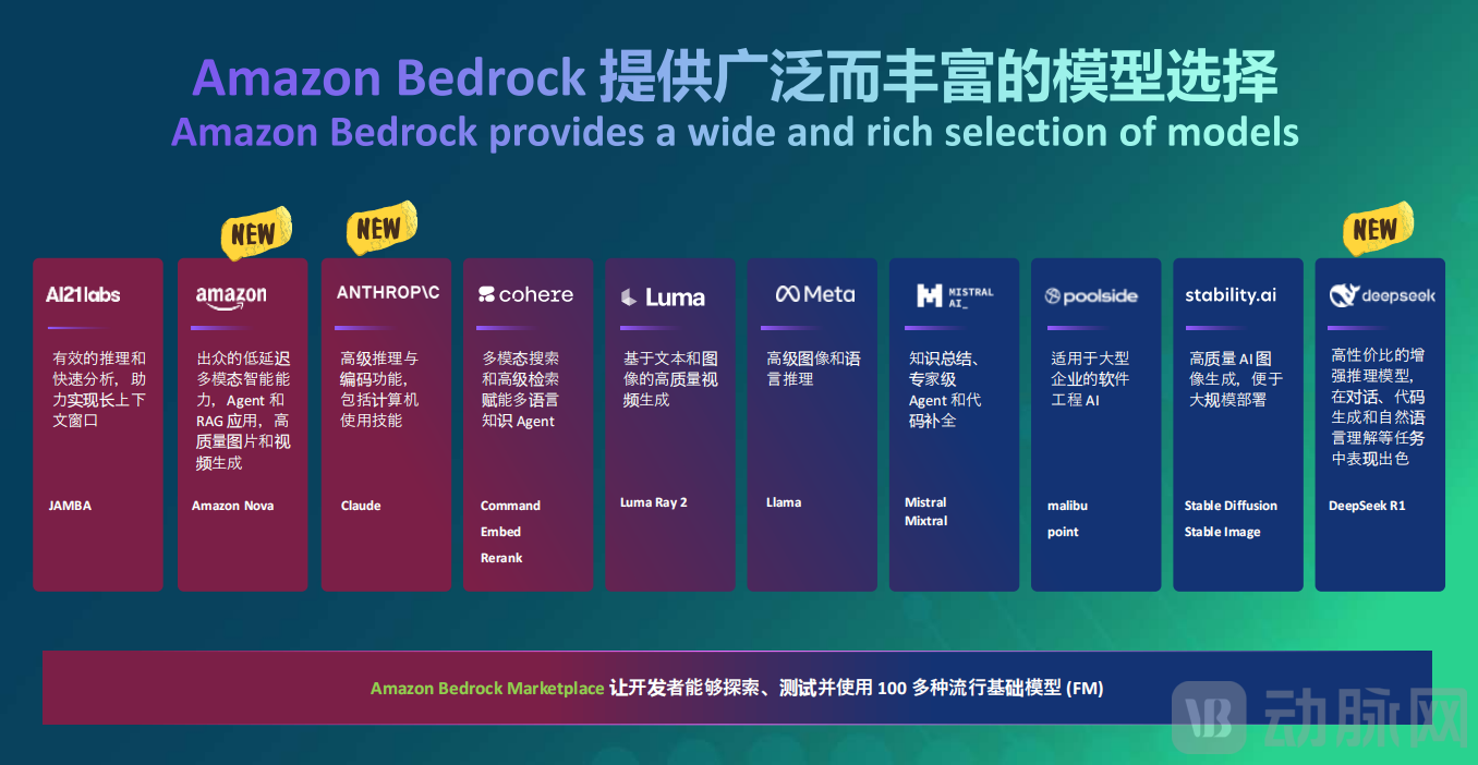 此外,Amazon Bedrock上还优选了一批顶尖的大模型,包括AnthropicClaude和DeepSeek。同时在此基础之上,Amazon Bedrock Marketplace还集聚了100余种的流行基础模型可供开发者探索、测试。模型选择的多样性拓宽了落地场景的边界。