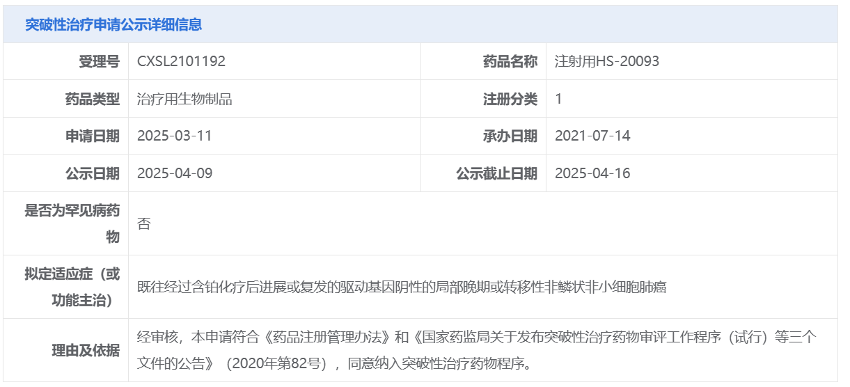 翰森生物注射用HS-20093获CDE拟纳入突破性治疗品种
