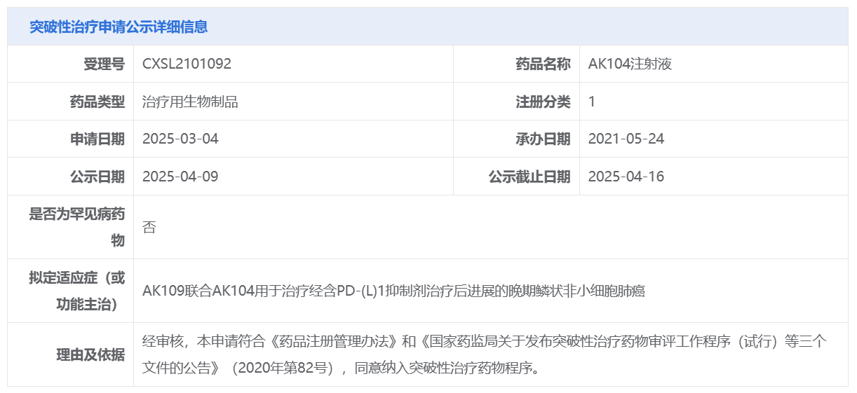 康方药业AK104注射液获CDE拟纳入突破性治疗品种