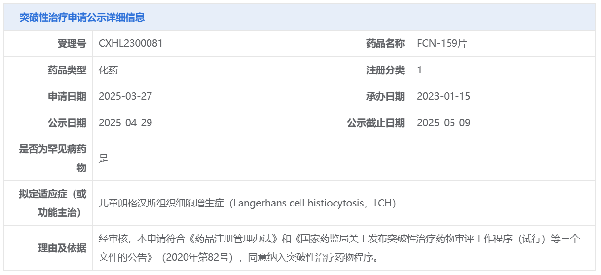 复星医药的FCN-159片获CDE拟纳入突破性治疗品种