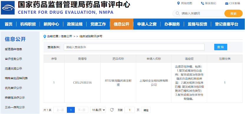 近日,柏全生物科技有限公司(以下简称“柏全生物”)宣布,公司自研的全新靶点抗肿瘤药物BT02单克隆抗体注射液,针对“血液恶性肿瘤”新适应症的临床试验申请(IND),正式获得国家药品监督管理局药品审评中心(CDE)批准。