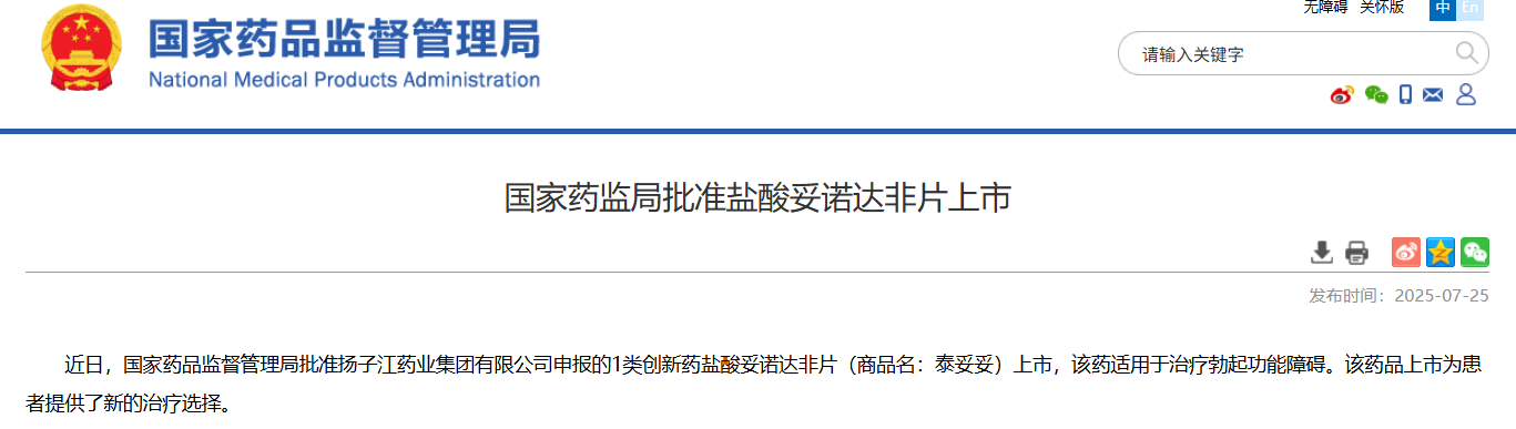 扬子江药业的盐酸妥诺达非片获NMPA批准上市