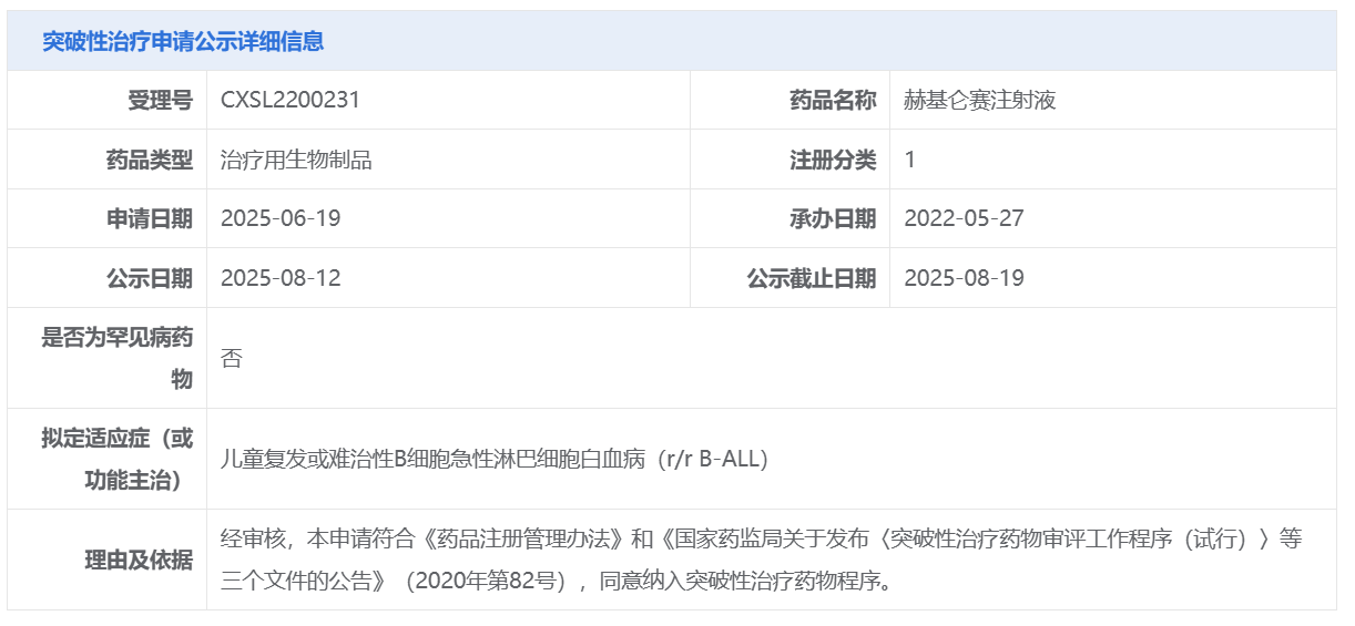 合源生物的赫基仑赛注射液获CDE拟纳入突破性治疗品种