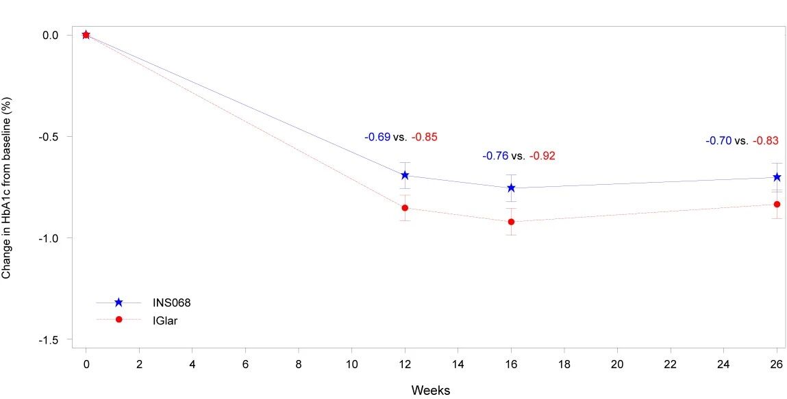 本研究达到预设的主要终点,治疗26周后,INS068组的HbA1c相对基线变化非劣于IGlar组。INS068组与IGlar组的HbA1c降幅分别为0.70%和0.83%,两组差值为 0.13%(95% CI:-0.05,0.31)。