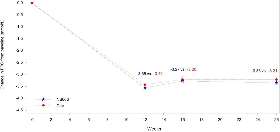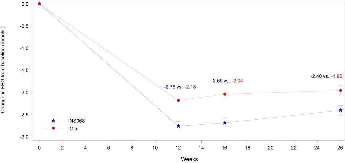 治疗26周后,INS068组FPG降幅大于IGlar组(均值变化:-2.40 mmol/L vs -1.96 mmol/L;两组差值:-0.45 mmol/L,95% CI:-0.74,-0.16)。