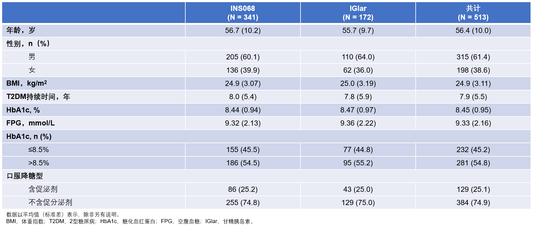 研究共入组513例中国成人T2DM受试者,INS068组和IGlar组分别入组341例和172例。