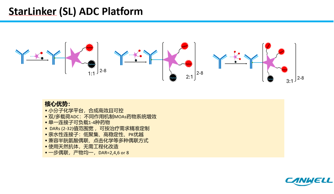 “第三,StarLinker与不同的有效载荷通过化学合成的方式提前合成好LP,纯度接近100%,然后将LP再与抗体偶联仅需一步化学偶联反应,不需要通过多步偶联不同的有效载荷,也不需要酶催化,抗体无需工程化改造,生产制备过程易操控且产率较高,这将有助于降低ADC的规模化生产成本。”余宁辉说。(见下图)