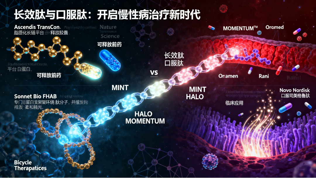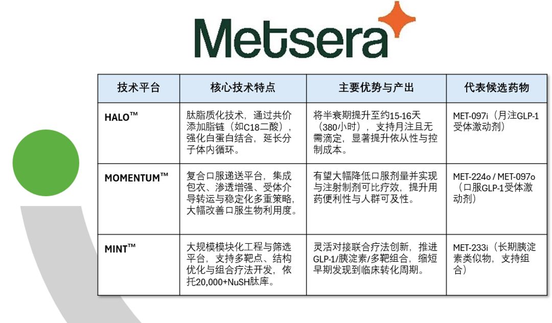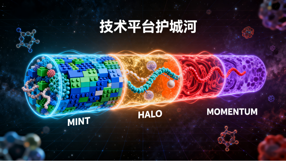 ·三大技术平台奠基,MINT肽库实现模块化候选分子设计,HALO延长半衰期支持月剂量给药,MOMENTUM口服递送平台提升生物利用度。