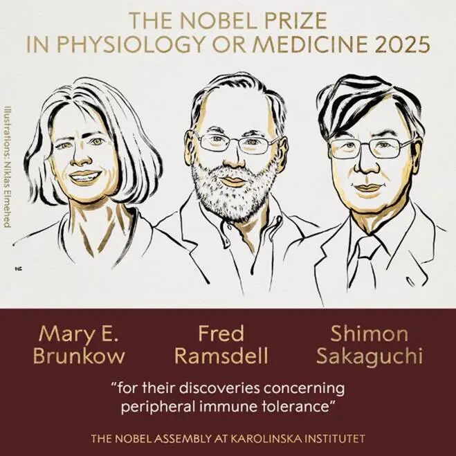 当地时间10月6日,瑞典卡罗琳医学院宣布,将2025年诺贝尔生理学或医学奖颁给Mary E. Brunkow、Fred Ramsdell 和坂口志文,以表彰他们在外周免疫耐受方面的研究贡献。