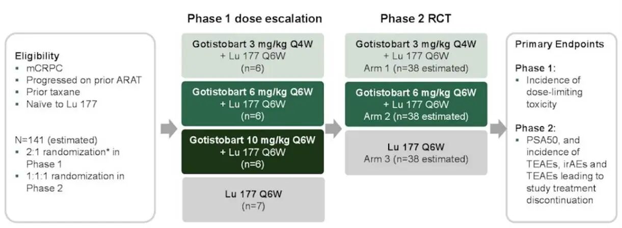 PRESERVE-006(NCT05682443)是一项开放标签、随机、主动对照、多中心的1/2期临床试验,旨在研究Gotistobart联合Lu 177治疗雄激素受体通路抑制后进展的mCRPC患者。