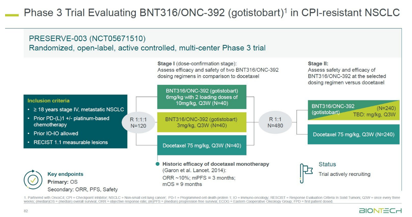 第二阶段,旨在评估gotistobart高剂量与多西他赛相比,治疗鳞状细胞非小细胞肺癌的安全性和有效性。研究主要终点是总生存期(OS)。