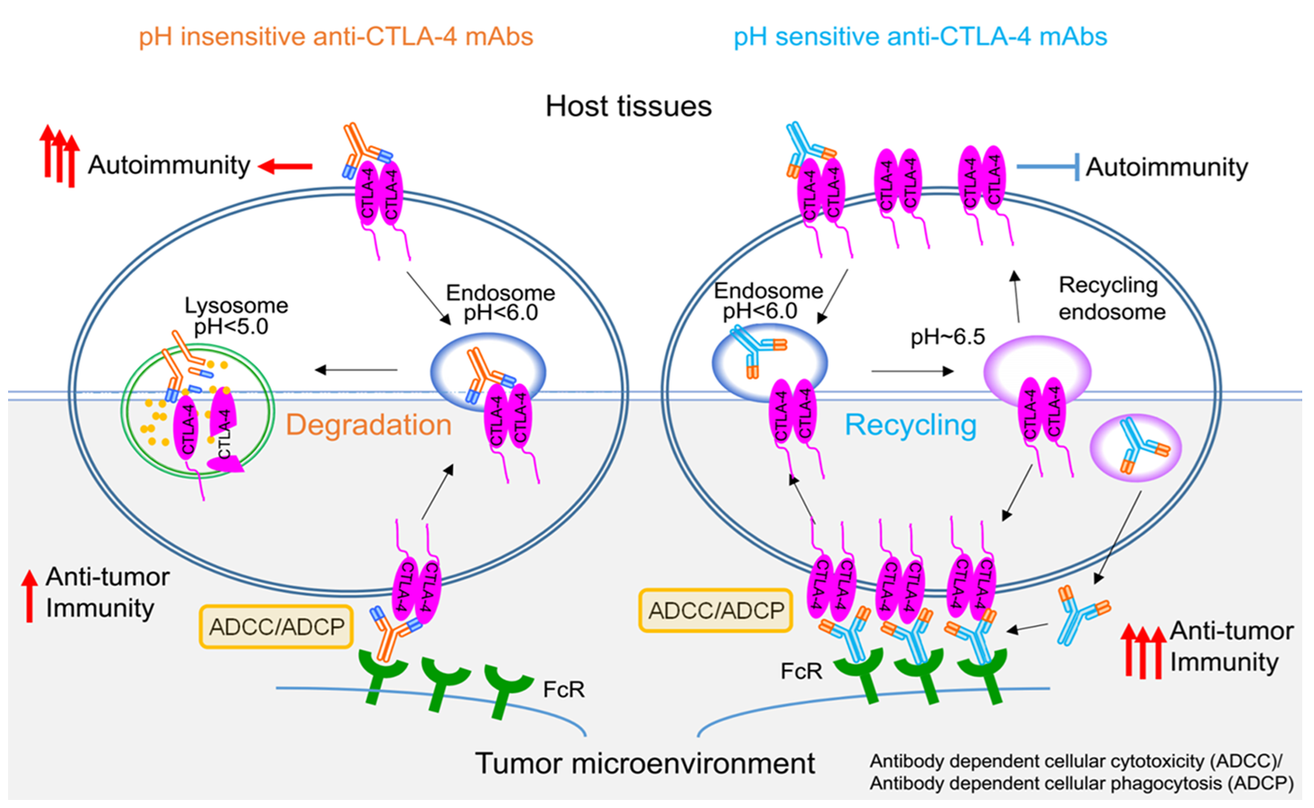 知名免疫学学家刘阳和郑盼团队的研究发现,CTLA-4抗体发挥作用,是通过强ADCC(抗体依赖的细胞介导效应)来清除肿瘤局部高表达CTLA-4的Treg细胞,从而降低Treg对杀伤性T细胞的抑制;而副作用是由于抗体与CTLA-4的结合体在内吞后被溶酶体清除,导致细胞表面CTLA-4大量减少引发自免反应。