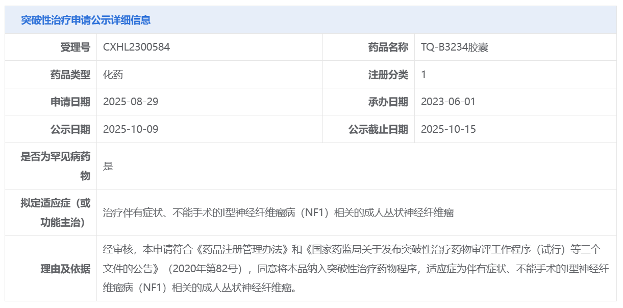 正大天晴的TQ-B3234胶囊获CDE拟纳入突破性治疗品种