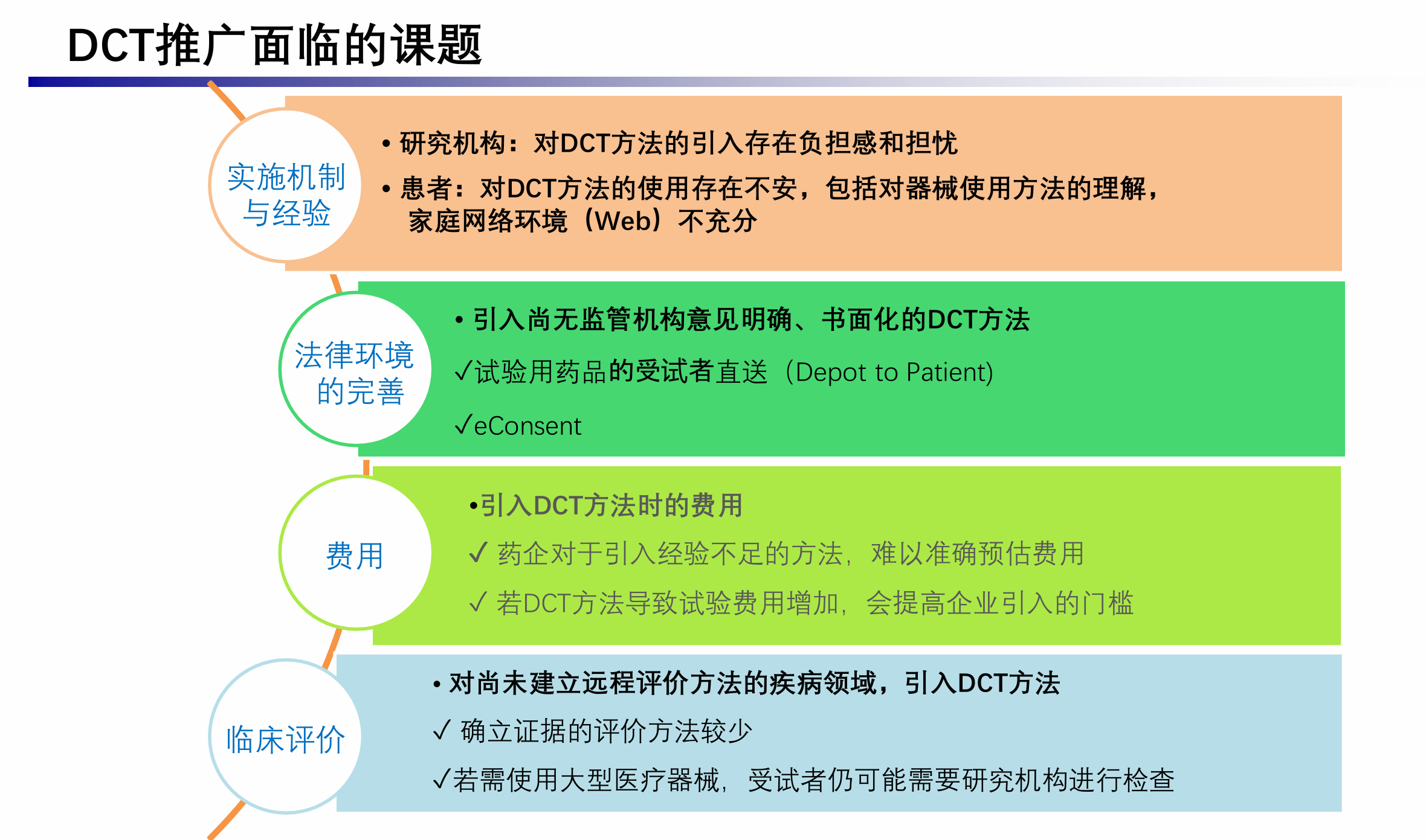 图2中列出了在引入DCT时对实施体系的担忧以及引入DCT时增加的费用负担等问题,尤其是“将试验用药品的受试者直送”等尚无监管机构意见明确书面化的DCT方法,其引入门槛较高,显示出法律和监管环境仍需进一步完善。