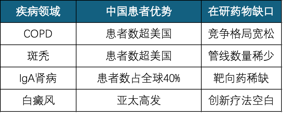 自免领域:COPD、斑秃等中国高发疾病在研药物严重不足。