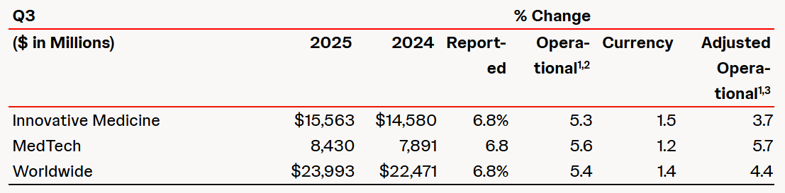 New Brunswick, N.J. (October 14, 2025) – Johnson & Johnson (NYSE: JNJ) today announced results for third-quarter 2025. “Johnson & Johnson delivered another strong performance in the third quarter fueled by the depth and strength of our portfolio and significant progress across our pipeline,” said Joaquin Duato, Chairman and Chief Executive Officer, Johnson & Johnson. “With a sharpened focus on the six priority areas of Oncology, Immunology, Neuroscience, Cardiovascular, Surgery and Vision, Johnson & Johnson is in a new era of accelerated growth and innovation, with pioneering treatments that will continue to transform lives.”