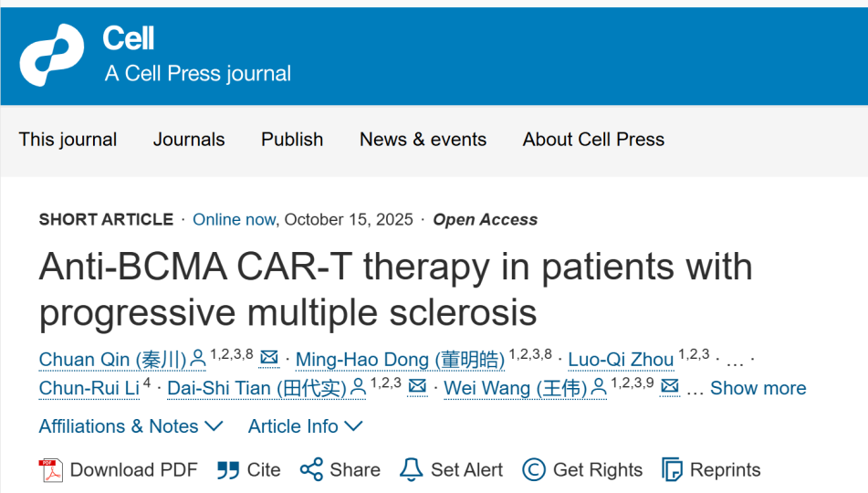 发表在《Cell》上的文章标题为“Anti-BCMA CAR-T Cells in Progressive Multiple Sclerosis (靶向BCMA CAR-T细胞疗法治疗多发性硬化症)”,(全文参见:www.cell.com/cell/fulltext/S0092-8674(25)01088-8)。此研究基于一项由华中科技大学同济医学院附属同济医院神经内科王伟教授团队主导的研究者发起的临床研究(NCT04561557)。