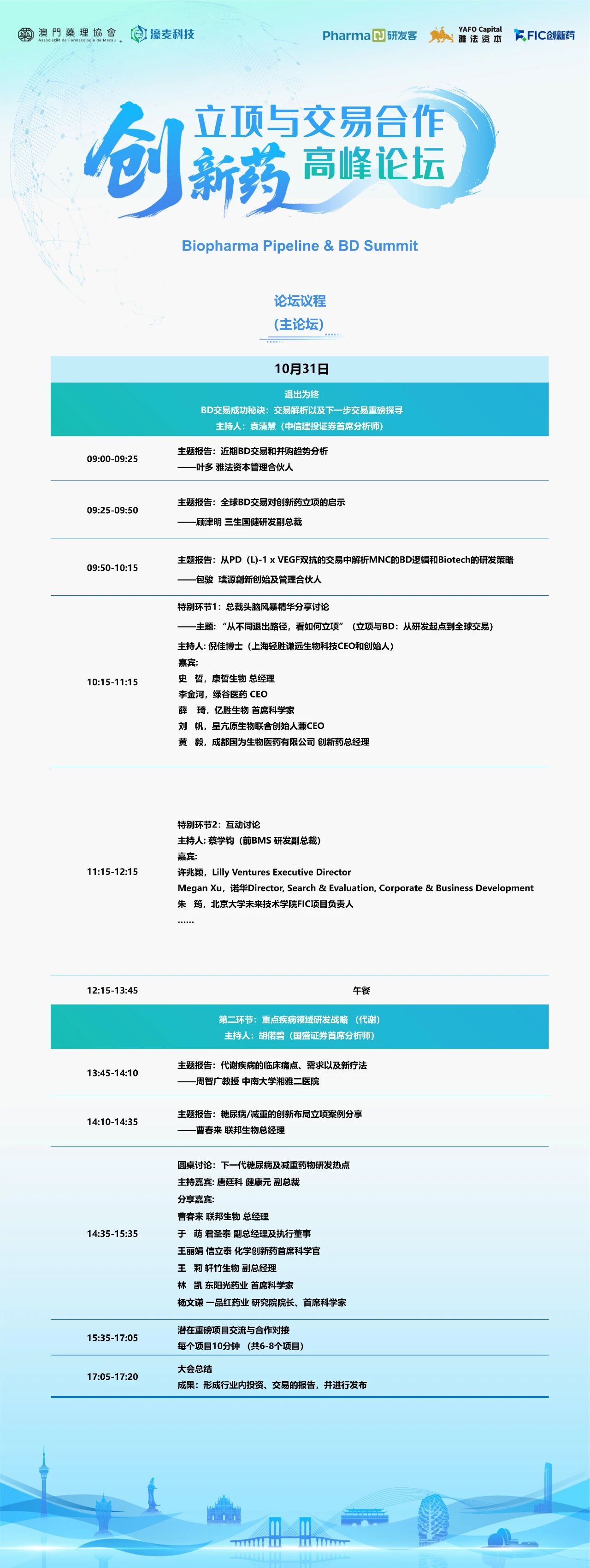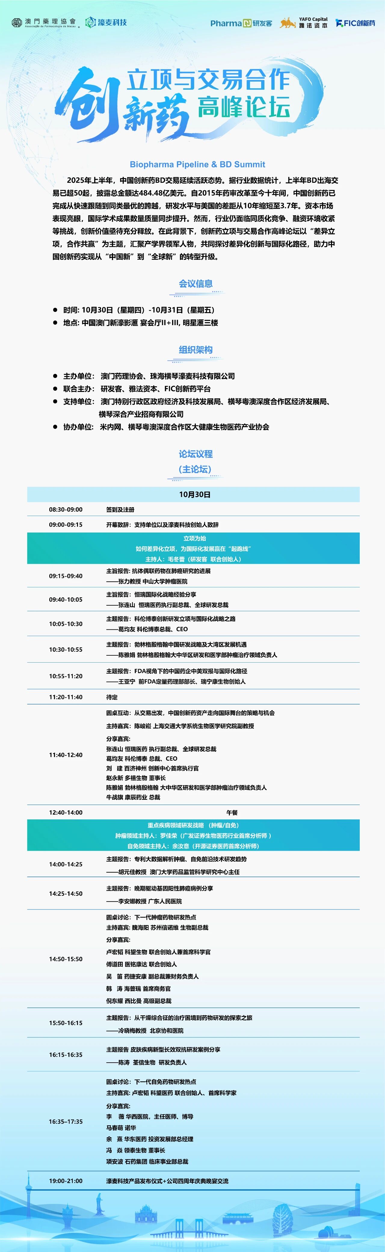 10月30-31日在澳门召开的“创新药研发立项与合作交易高峰论坛”首日下午的议程聚焦于肿瘤和自免两大疾病领域的研发战略,将汇集行业领军人物,带来主题报告和讨论。
