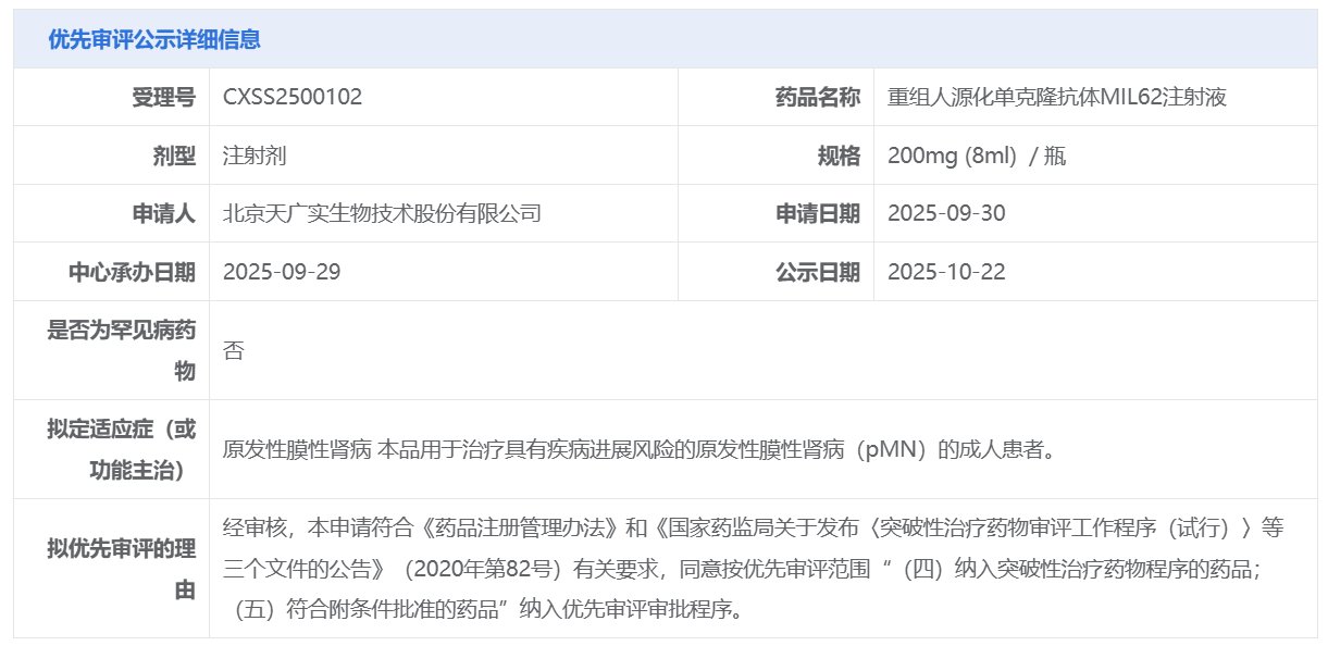天广实的重组人源化单克隆抗体MIL62注射液获CDE拟纳入优先审评