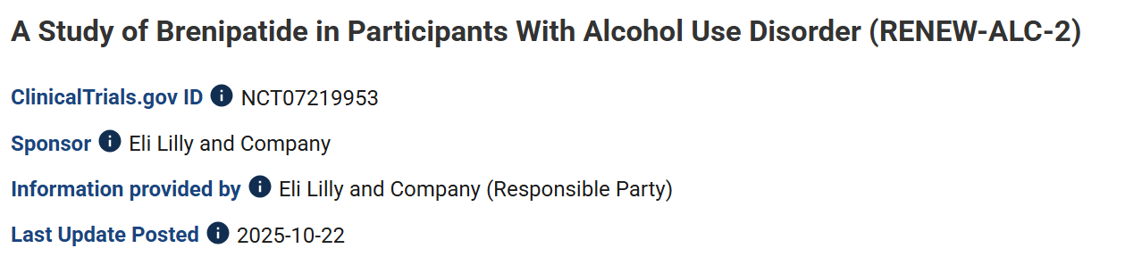 礼来启动一项Brenipatide用于酒精使用障碍(Alcohol Use Disorder, AUD)的III期临床研究