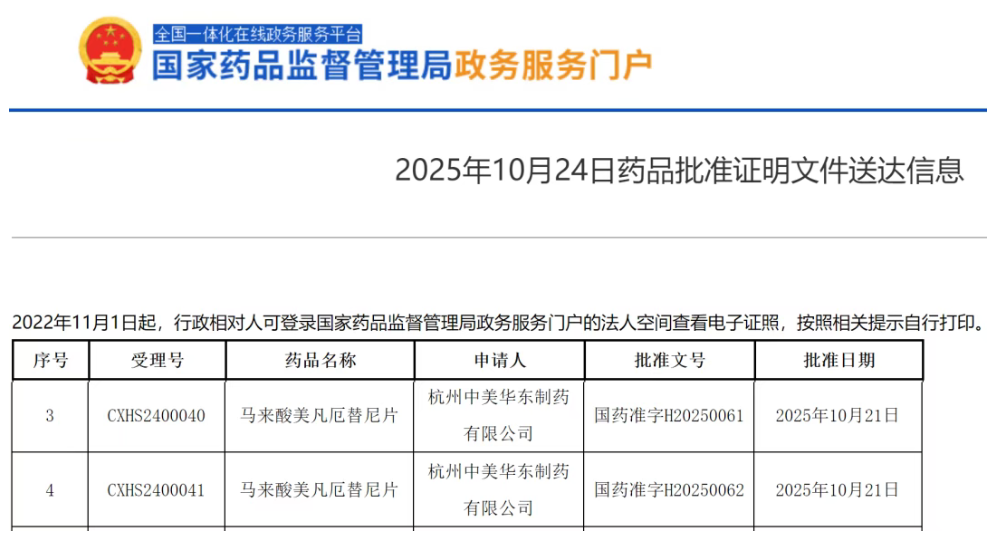 中美华东向NMPA申报的1类新药马来酸美凡厄替尼片获批上市